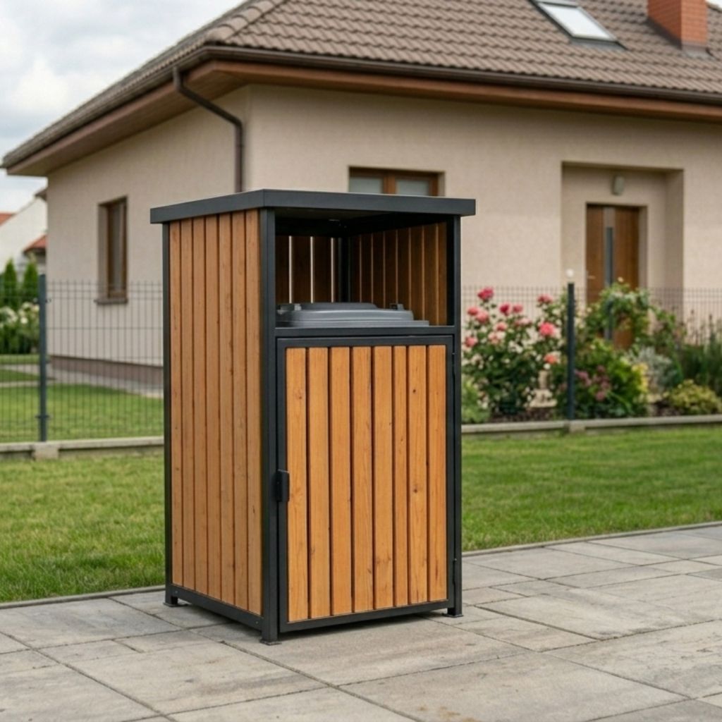 Szukasz eleganckiego sposobu na ukrycie przydomowych pojemników na odpady? Nasza nowoczesna zabudowa na pojedyńczy kosz 120L to harmonijne połączenie industrialnej stali malowanej proszkowo oraz naturalnego ciepła drewna. Projekt został stworzony z myślą o prywatnych posesjach i domach jednorodzinnych, gdzie estetyka ogrodu i podjazdu jest równie ważna, co ich funkcjonalność.