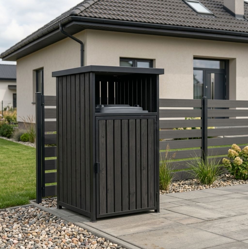 Szukasz eleganckiego sposobu na ukrycie przydomowych pojemników na odpady? Nasza nowoczesna zabudowa na pojedyńczy kosz 240L to harmonijne połączenie industrialnej stali malowanej proszkowo oraz naturalnego ciepła drewna. Projekt został stworzony z myślą o prywatnych posesjach i domach jednorodzinnych, gdzie estetyka ogrodu i podjazdu jest równie ważna, co ich funkcjonalność.